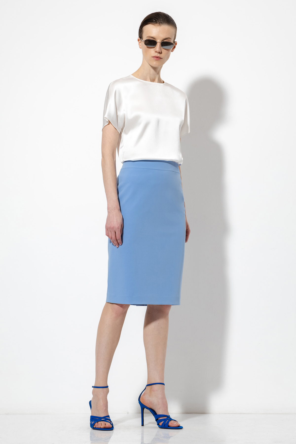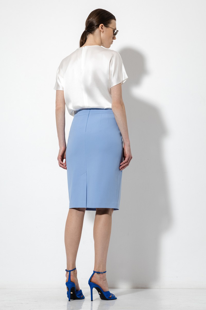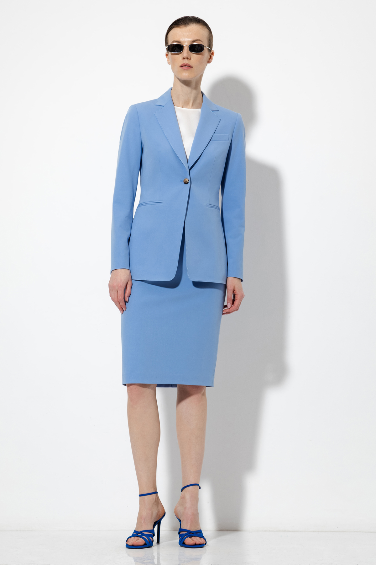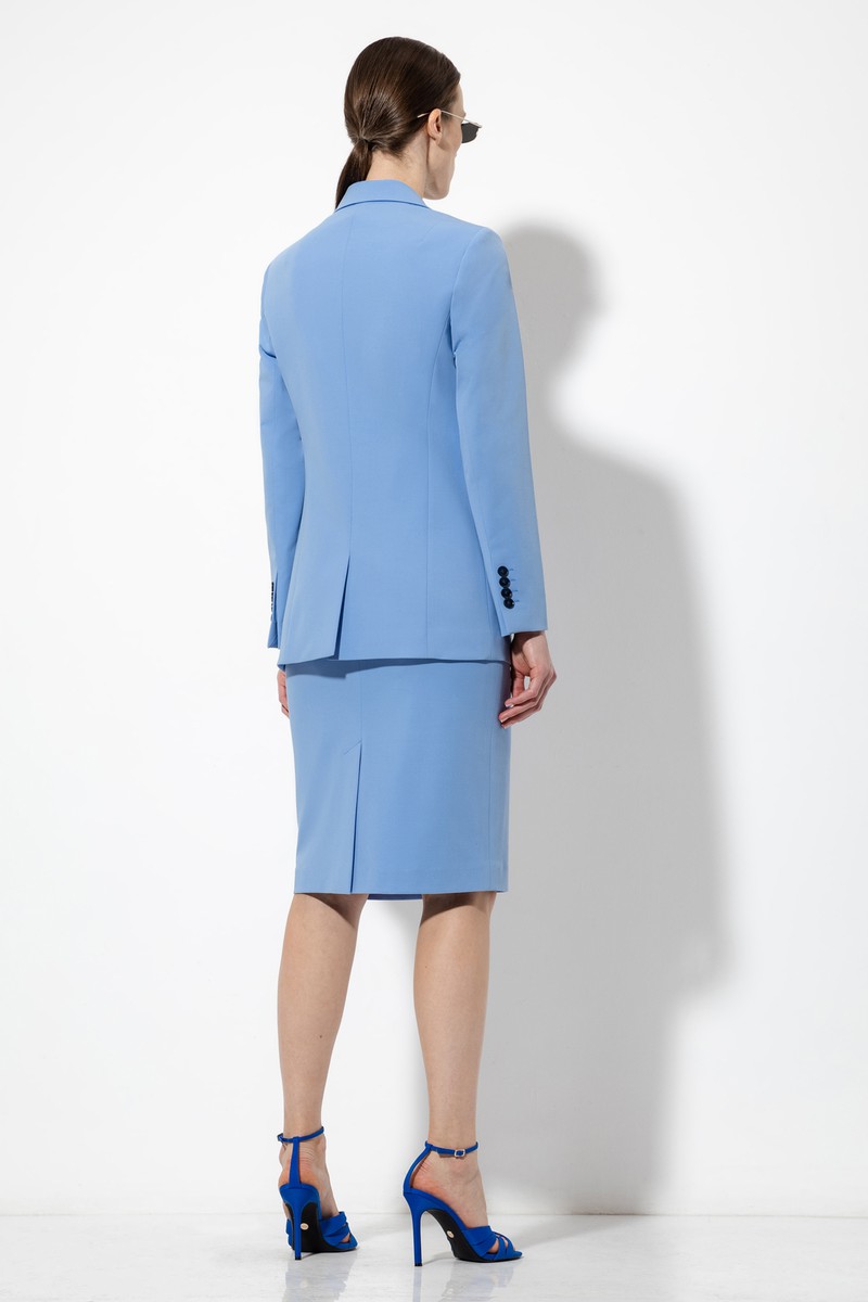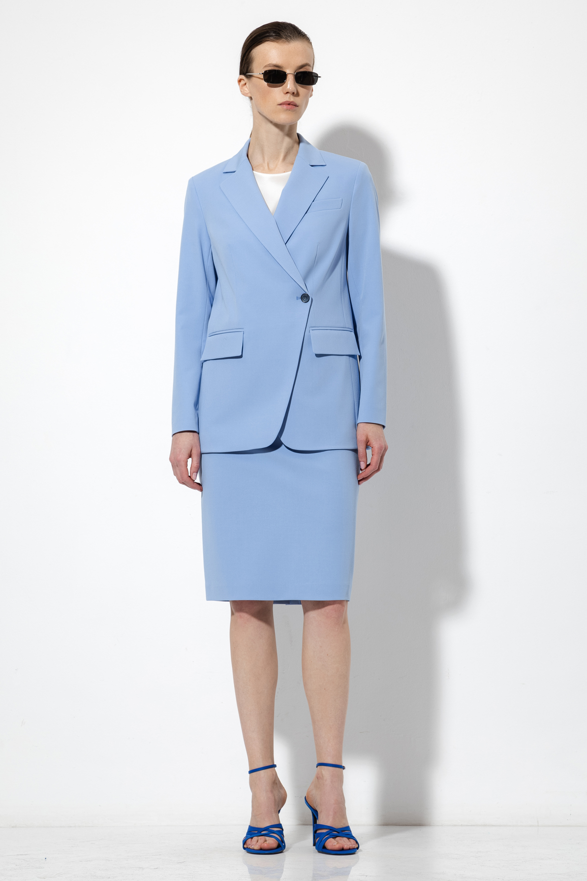 Объемный жакет со смещенной застежкой. Модель прямого кроя дополнена имитацией карманов, графичными лацканами и контрастной пуговицей. Широкие брюки со стрелками и высокой посадкой. Пояс со шлевками позволяет дополнить образ ремнем. Элегантная юбка в классической длине до колен. Модель прямого кроя со средней посадкой, шлицей на задней поверхности и застежкой на потайную молнию.